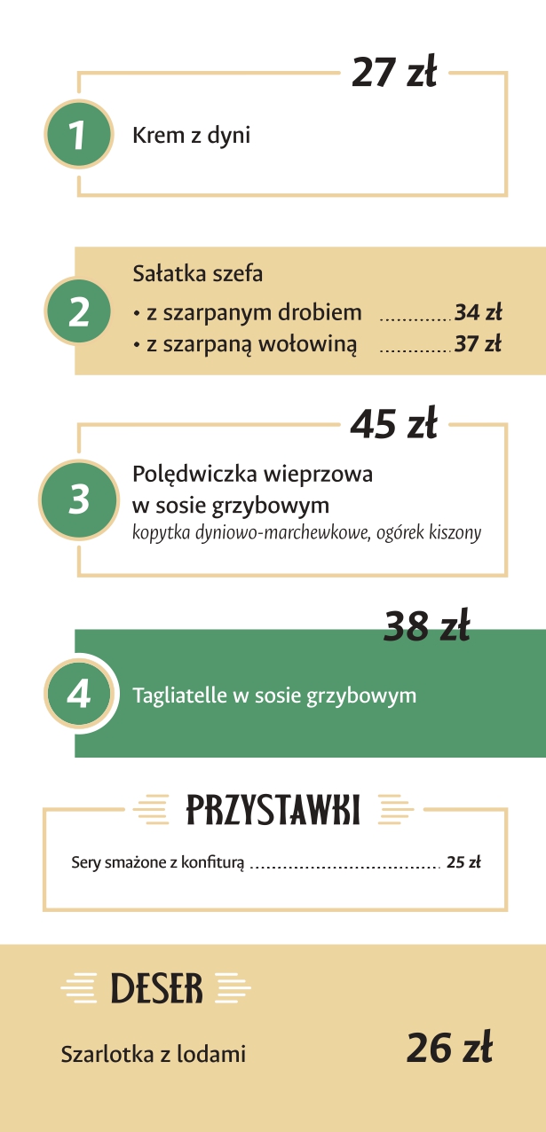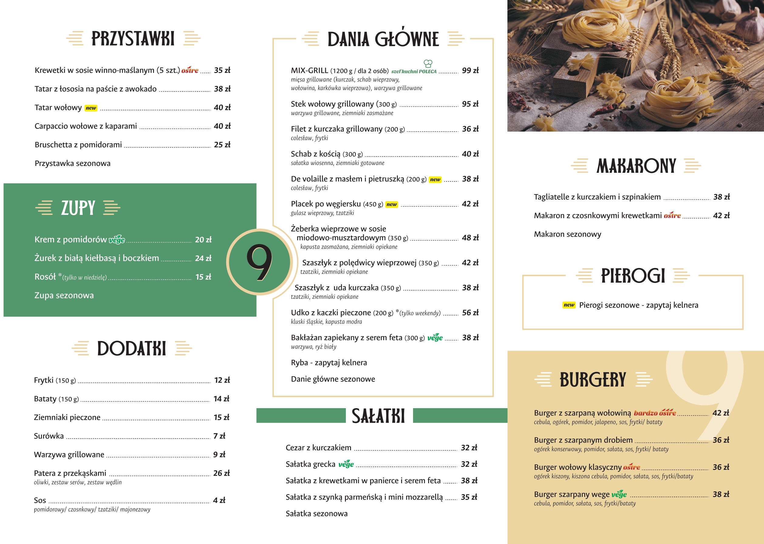 Serwujemy dania z charakterem – szczególną uwagę zwraca Mix Grill („uczta dla prawdziwych mięsożerców”) oraz szaszłyki pachnące jak ognisko – wykonane ze świeżych warzyw i wysokiej jakości mięsa.